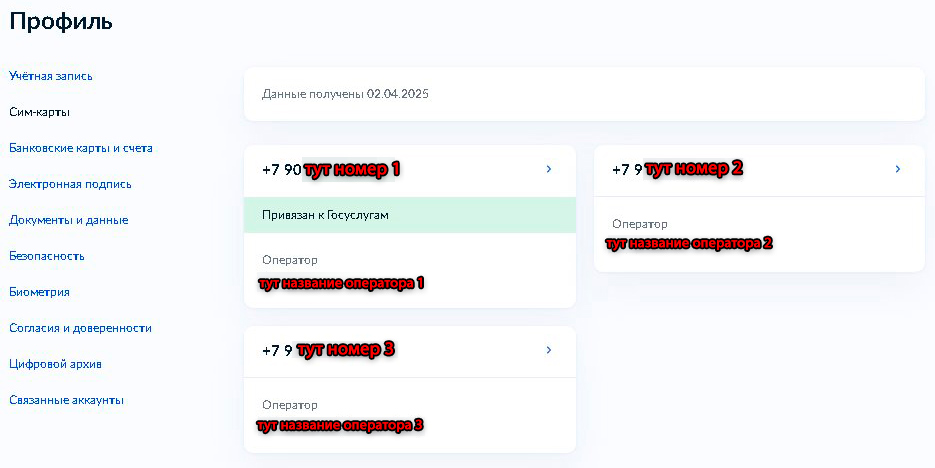 Теперь мы можем увидеть все SIM-карты, которые были зарегистрированы на наши паспортные данные. В каждой карточке отображаются: телефонный номер, информация о том, привязана ли SIM к порталу государственных услуг Российской Федерации, и оператор сотовой связи.