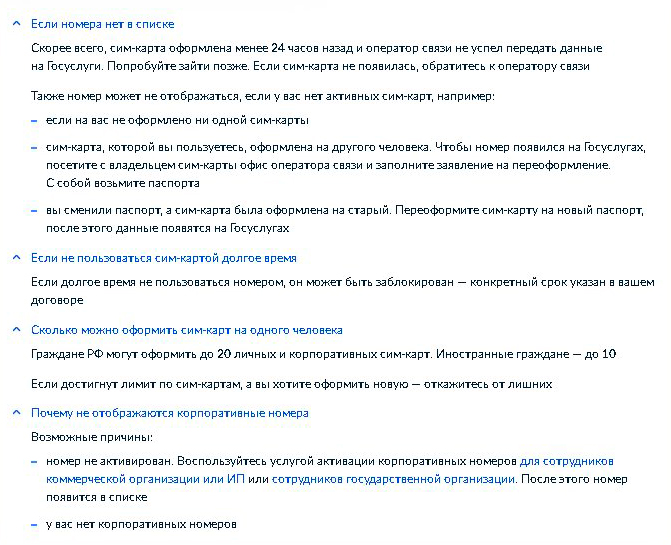 Ниже, под списком СИМ Госуслуг, мы можем почитать некоторые заранее подготовленные ответы на вопросы, которые могут возникнуть, но мне это было неинтересно, и я нажал на карточку с номером телефона.