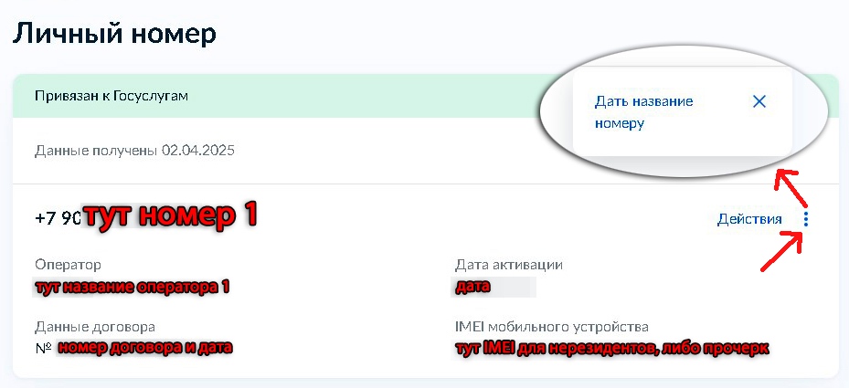 В новом окне мы видим всё те же данные, а также номер договора с оператором связи и IMEI устройства, к которому привязана SIM-карта нерезидента РФ, в ином случае будет стоять прочерк. Кнопка «Действия» не предлагает ничего кроме как дать название телефонному номеру, который будет отображаться в списке на портале. Возможно, в будущем появятся функции блокировки или обновления данных СИМ Госуслуг в сторону оператора. Но пока кнопка не имеет смысла.