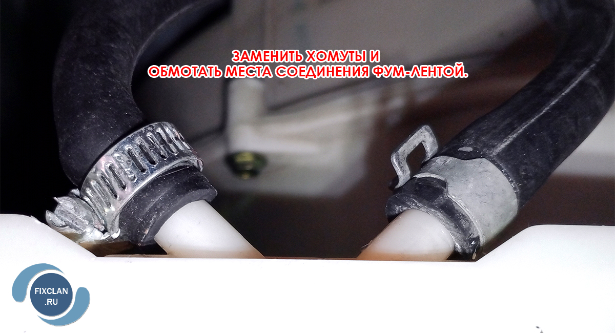 В момент забора воды сразу же потёк один из заливных патрубков — в месте его соединения с бункером (где порошок смешивается с водой). Видимо, из-за старости резины и рифлёного пластикового соединения, а также ослабленного хомута вода под давлением начала вытекать наружу. Это было легко исправить: заменил хомут на винтовой и обмотал соединение фум-лентой.