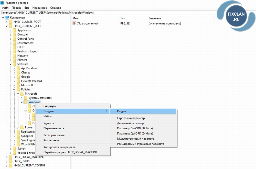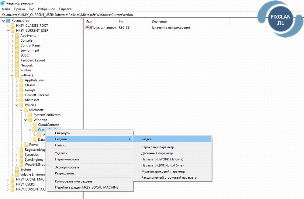 - на последней папке, CurrentVersion, жмём правую кнопку мыши и в контекстном меню выбираем «Создать» и «Раздел»;
