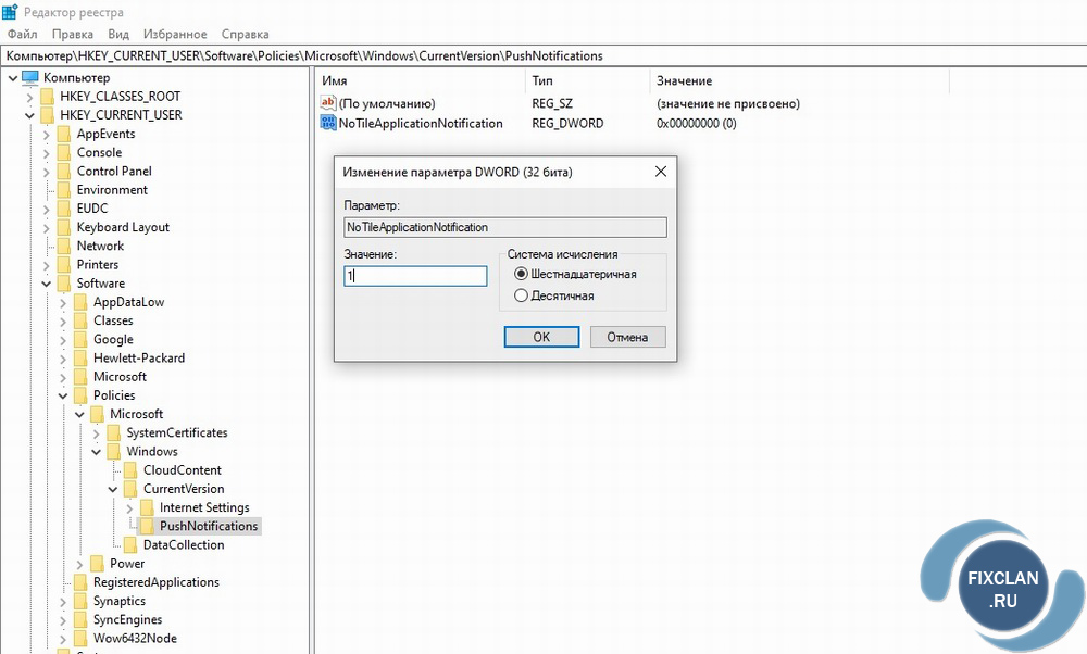- указываем ему имя «NoTileApplicationNotification» и вводим шестнадцатиричное значение 1;