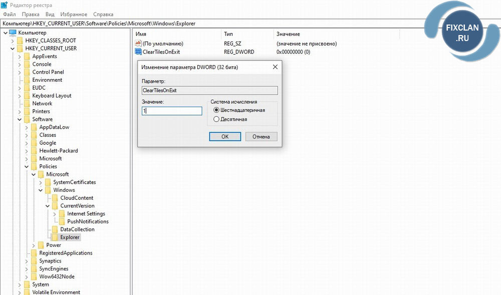 - тут создаем «Параметр DWORD (32 бита)» с именем ClearTilesOnExit и значением 1;