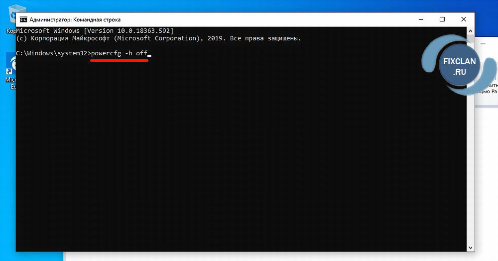 - в загадочном, темном окошечке с непонятными буковками, вводим следующее - powercfg -h off;