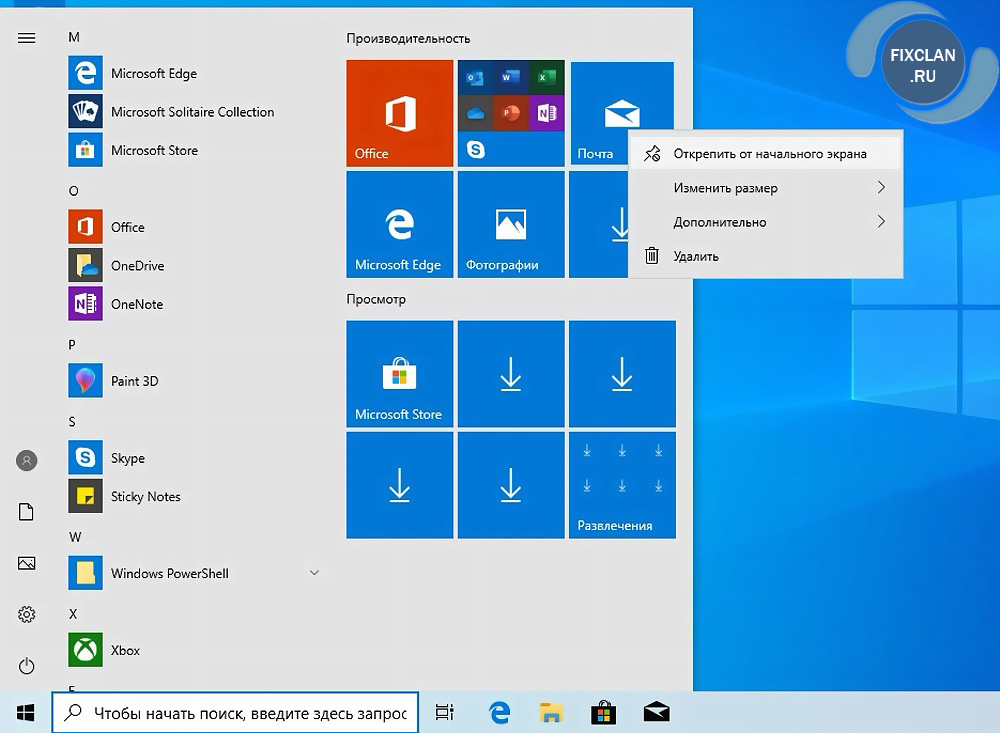 - в открывшемся контекстном меню выбираем «Открепить от начального экрана»;
