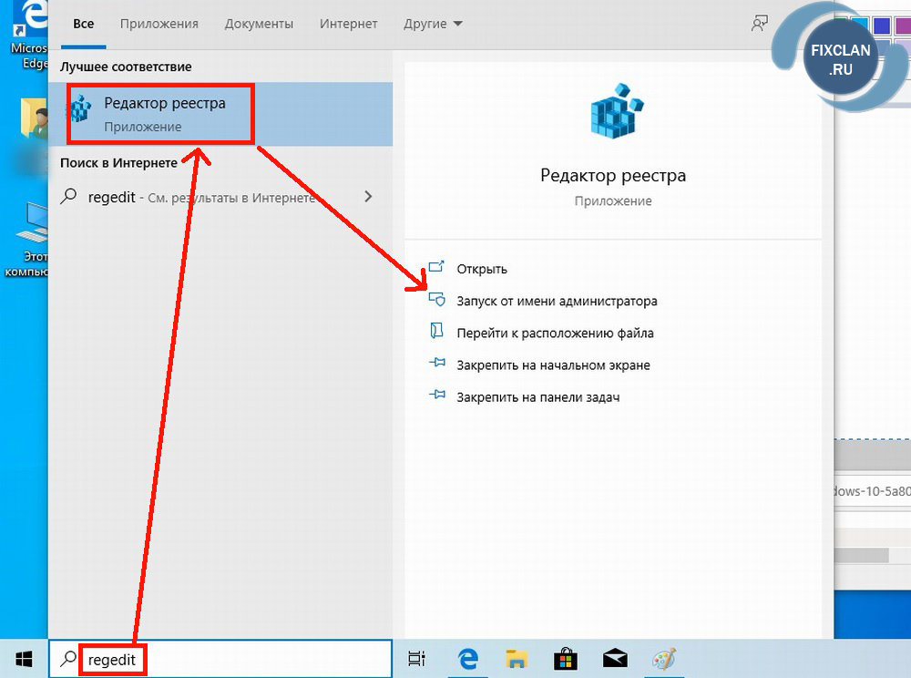 - в поиске, около кнопки «Пуск», вводим regedit и запускаем Редактор реестра от имени Администратора, аналогично, как было с cmd;