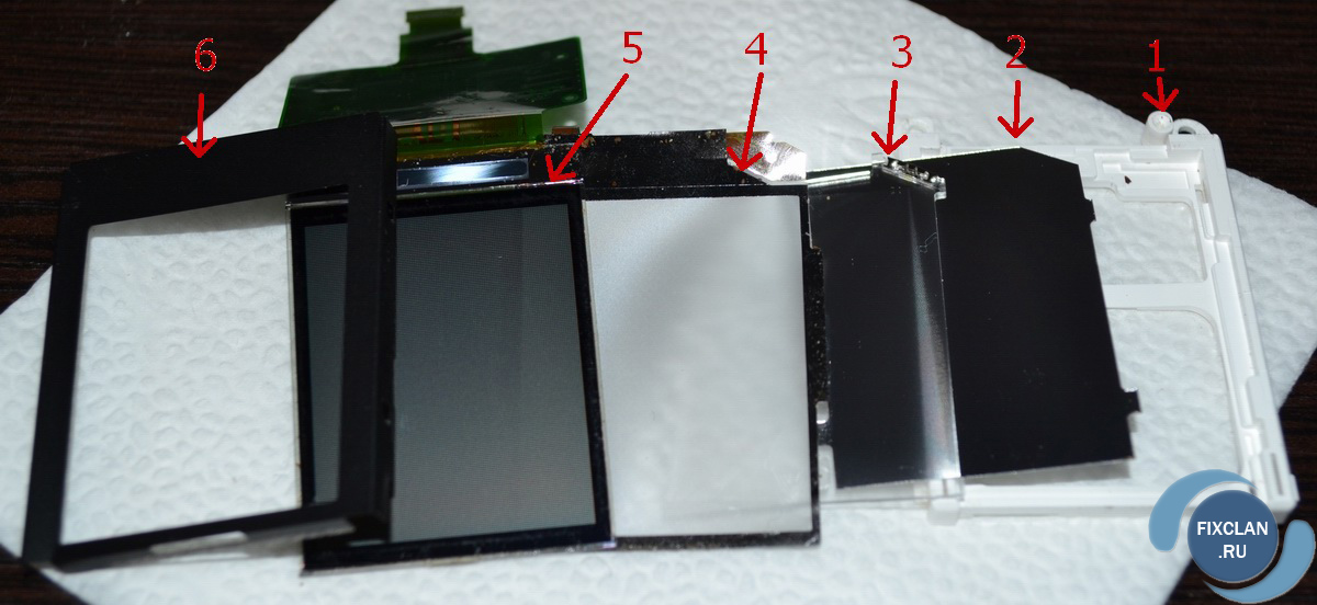 Шестое (6) – рамка дисплея, поджимающая весь этот «бутерброд» к основанию.